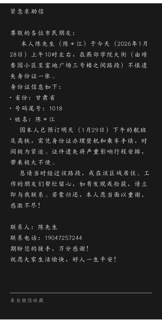 紧急求助:寻找遗失身份证