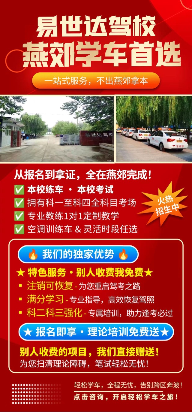 易世达驾校火爆招生进行中! 燕郊学车,燕郊考试! 🚗C1手动挡普通班:2800 (自己承担补考费) 🚗C1🚙C2学生班:3000(包补考费考场练车) 🚗